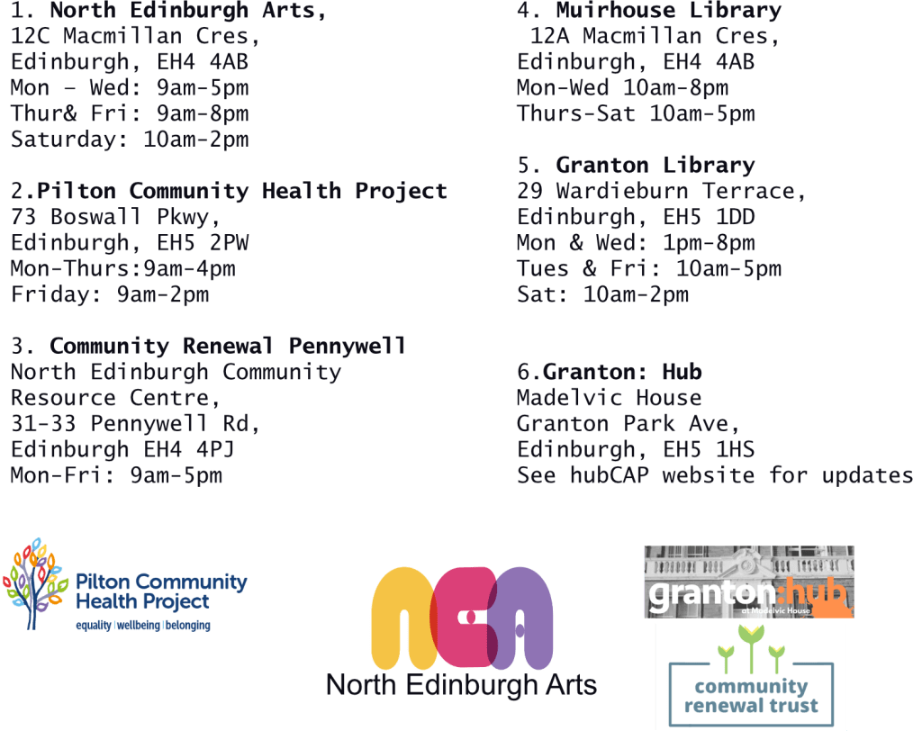 The community exhibition features work created at Edinburgh College during screen printing and image transfer workshops run by hubCAP committee members. The resulting work is displayed in communal spaces around North Edinburgh to bring art to the wider community.